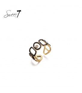 Goudkleurige ring met zwarte steentjes en bedels. De ringmaat van de ring is 1 maat De ringen zijn nikkelvrij.