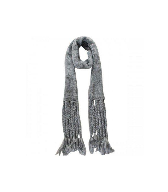 Gebreide grijze sjaal met lange gevlochten franjes.