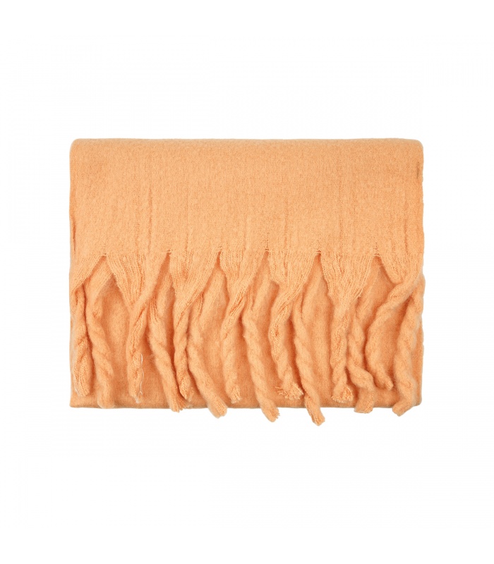 Leuke oranje wintersjaal met gedraaide franjes.