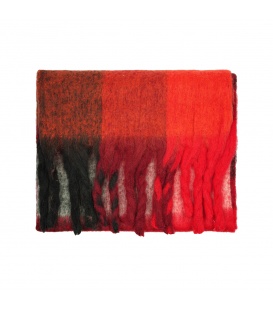 Rode wintersjaal met zwarte patroon. De afmeting van de sjaal is 190 bij 55 cm. De sjaal is gemaakt van polyester.