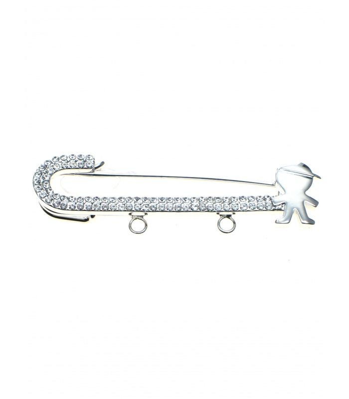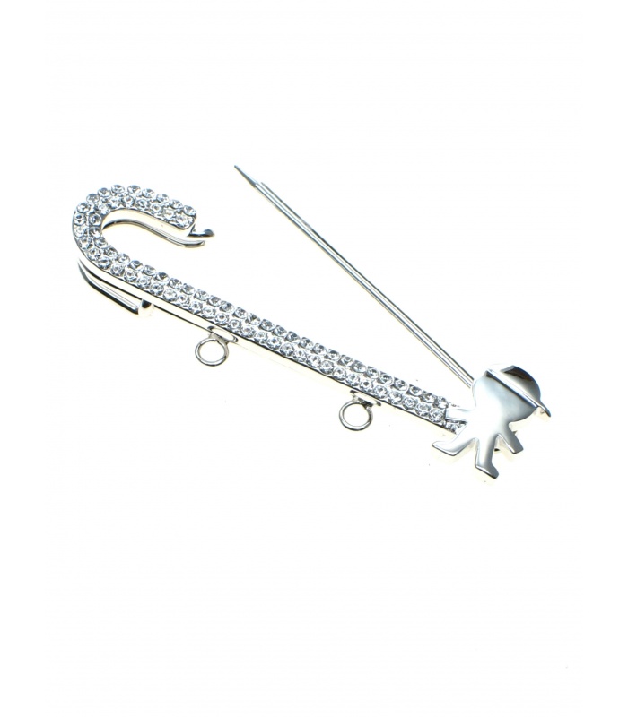 Mooie zilverkleur sjaalspeld, veiligheidsspeld met strass steentjes en klein mannetje.