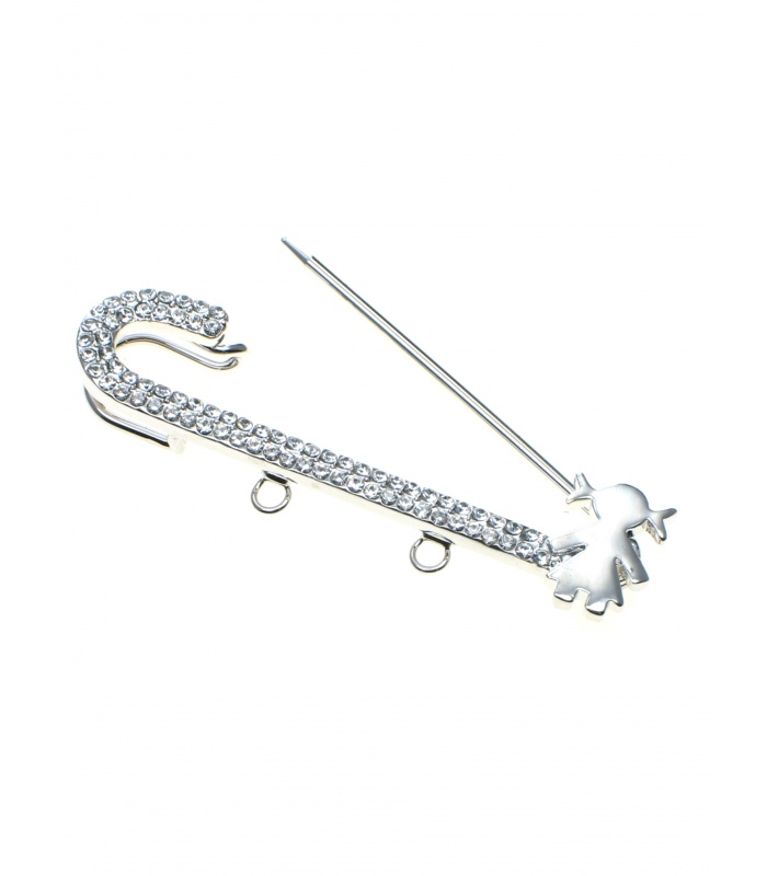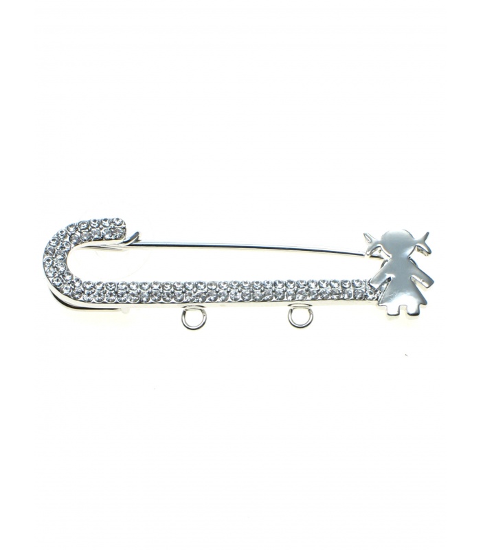 Zilverkleur sjaalspeld met meisje en heldere strass steentjes.