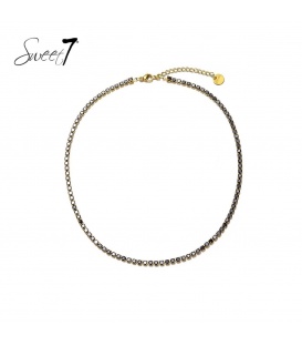 Zwarte schakel halsketting met goudkleurige elementen. Zwarte schakel halsketting, verfijnd met goudkleurige elementen. De klassieke zwarte schakels vormen een stijlvol contrast met de warme gouden accenten, wat resulteert in een moderne en chique uitstraling. Zwarte schakel halsketting met goudkleurige elementen.