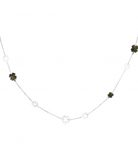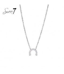 Zilverkleurige halsketting met verschillende hangers. De lengte van de halsketting is circa 38 cm. De ketting heeft een verlengkettinkje van 5 cm