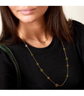 Verfijnde goudkleurige halsketting met groen natuursteentje. Deze goudkleurige halsketting is een prachtig voorbeeld van subtiele elegantie. De fijne ketting draagt een betoverend groen natuursteentje dat warmte en natuurlijke schoonheid uitstraalt. De combinatie van het goudkleurige metaal en het groene steentje creëert een harmonieus geheel.