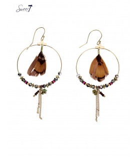 Goudkleurige oorhangers met gekleurde kralen en een bruin veertje De lengte van deze oorbel is 9 cm. Voor oren met gaatjes. De oorbellen zijn nikkelvrij. De oorbellen zijn voorzien van stoppertjes.