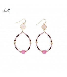 Roze met donkerrode kralen oorhangers De lengte van deze oorbel is 7 cm. Voor oren met gaatjes. De oorbellen zijn nikkelvrij. De oorbellen zijn voorzien van stoppertjes.