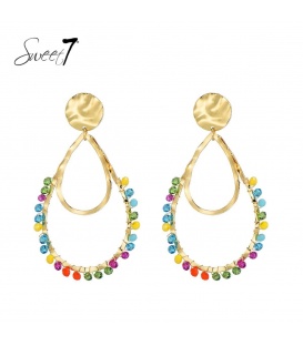 Gekleurde ovale oorhangers met goudkleurig koord en oorstukje De lengte van deze oorbel is 5.5 cm. Voor oren met gaatjes. De oorbellen zijn nikkelvrij De oorbellen zijn voorzien van stoppertjes.