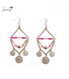 Roze met goudkleurige kralen oorbellen. De lengte van deze oorbel is 4 cm. Voor oren met gaatjes. De oorbellen zijn nikkelvrij. De oorbellen zijn voorzien van stoppertjes.