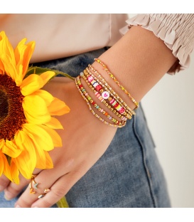 Terra cotta kleurige lange glas kralen halsketting met mooie elementen. De lengte van de halsketting is circa 100 cm. De ketting heeft een verlengkettinkje van 3 cm.