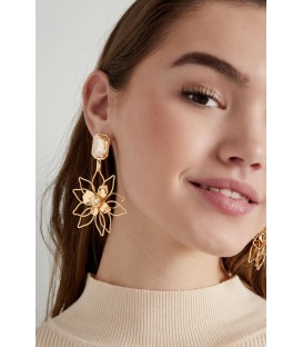 Chique oorbellen met gouden bloemen, steen en ring. Deze schitterende goudkleurige bloemen oorhangers met een steen en een ring zijn een verfijnde aanvulling op elke sieradencollectie. Ideaal voor zowel alledaagse gelegenheden als feestelijke avonden, stralen deze oorbellen klasse en stijl uit.