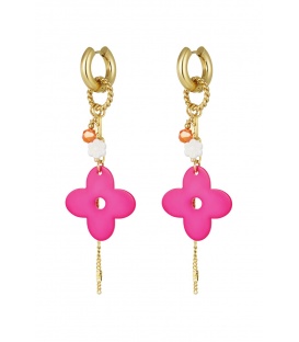 Fuchsia roze oorhangers met een bloem motief en stras steentjes. De lengte van deze oorbel is circa 4 cm. Voor oren met gaatjes. De oorbellen zijn nikkelvrij.