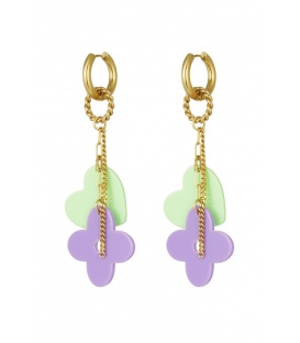 Sierlijke oorringen met paarse bloemdecoraties.Deze verfijnde goudkleurige oorringen met gekleurde bloemetjes zijn een must-have accessoire voor elke modebewuste vrouw. De subtiele bloemetjes voegen een speelse en toch elegante touch toe, perfect voor zowel dagelijkse outfits.