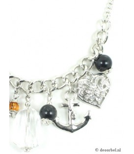 zilver met grijskleurige 3 strengs halsketting met kanten bloem